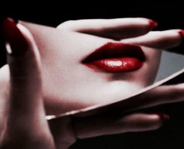 Mouth is full, and almost always painted red when visible. Teeth are fanged and especially sharp to flesh.