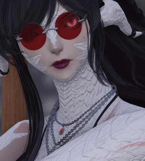 Pale complexion; she has scars littering her arms, legs, chest, and back. Like all Raen Au Ra, her scales, horns, and tail are lighter in color -- as a child her scales were pale yellow, but have since lightened into white. Several of her scales are deformed from scar tissue.